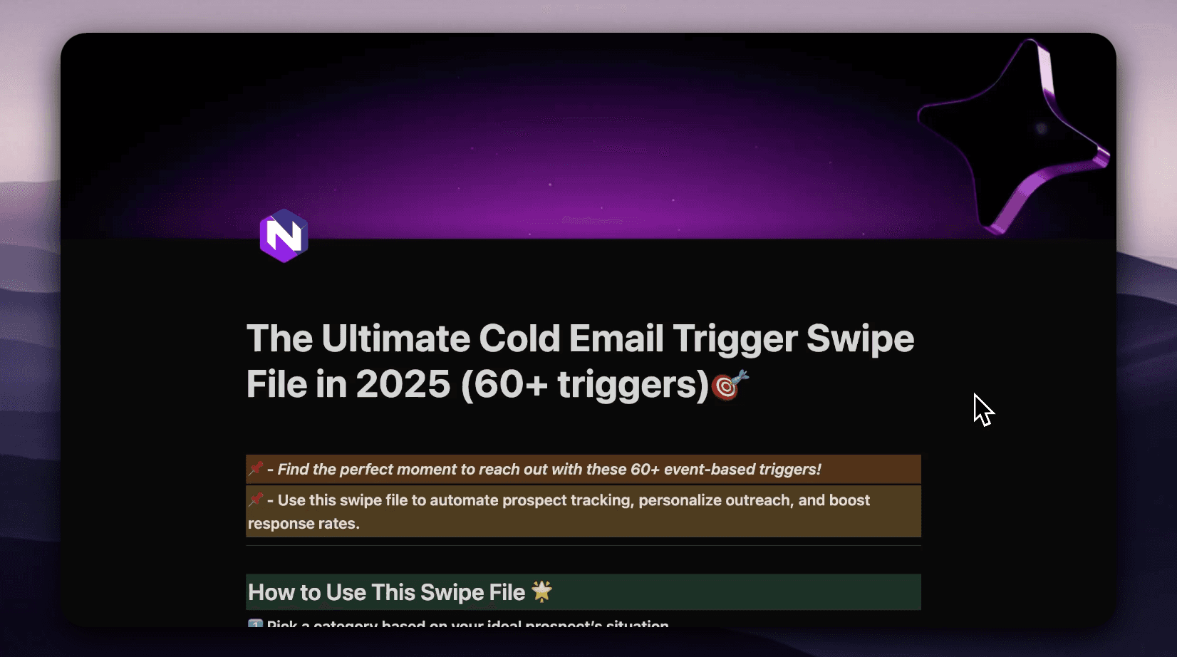 This Cold Email Trigger Swipe File reveals 60+ signals that show when a prospect is ready to buy. Know exactly when to reach out and how to personalize your message for maximum impact.